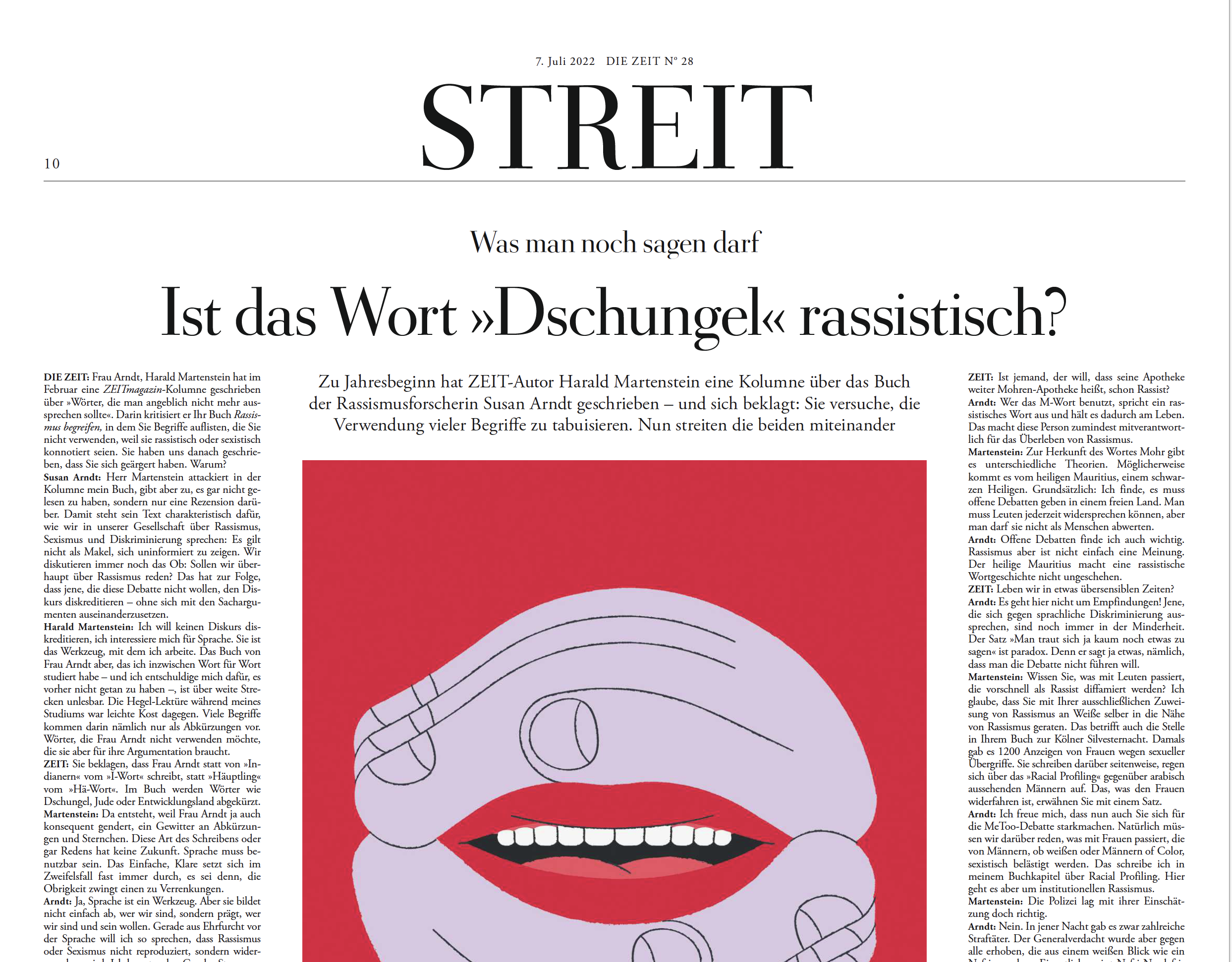 DIE ZEIT: Frau Arndt, Harald Martenstein hat im Februar eine ZEITmagazin-Kolumne geschrieben über »Wörter, die man angeblich nicht mehr aussprechen sollte«. Darin kritisiert er Ihr Buch Rassismus begreifen, in dem Sie Begriffe auflisten, die Sie nicht verwenden, ...more