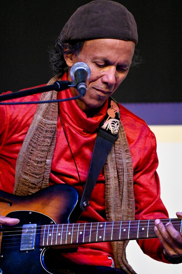 Leader of several projects, he founded Jozéfinn’, whose unique Indo-Oceanic “world jazz” (album Mascamad, 2006) has established itself as a benchmark of the genre. Numerous inspiring collaborations followed with artists such as the late French guitarist Sylvain Luc and many others. His work has also been praised in the specialist press Guitarist Acoustic.