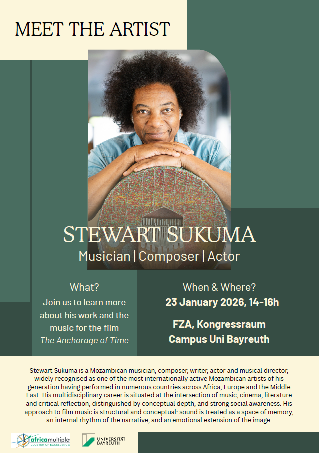 Stewart Sukuma is a Mozambican musician, composer, writer, actro and musical director, widely recognised as one of the most internationally active Mozambican artists of this generation having performed in numerous countreis across Africa, Europe and the Middle East. His multidisciplinary career is situated at the intersection of music, cinema, literature and critical reflection, distinguished by conceptual depth, and strong social awareness. his approach to film music is structural and conceptual: sound is treated as a space fo memory, an internatl rhythm of the narrative, and an emotional extension of the image.