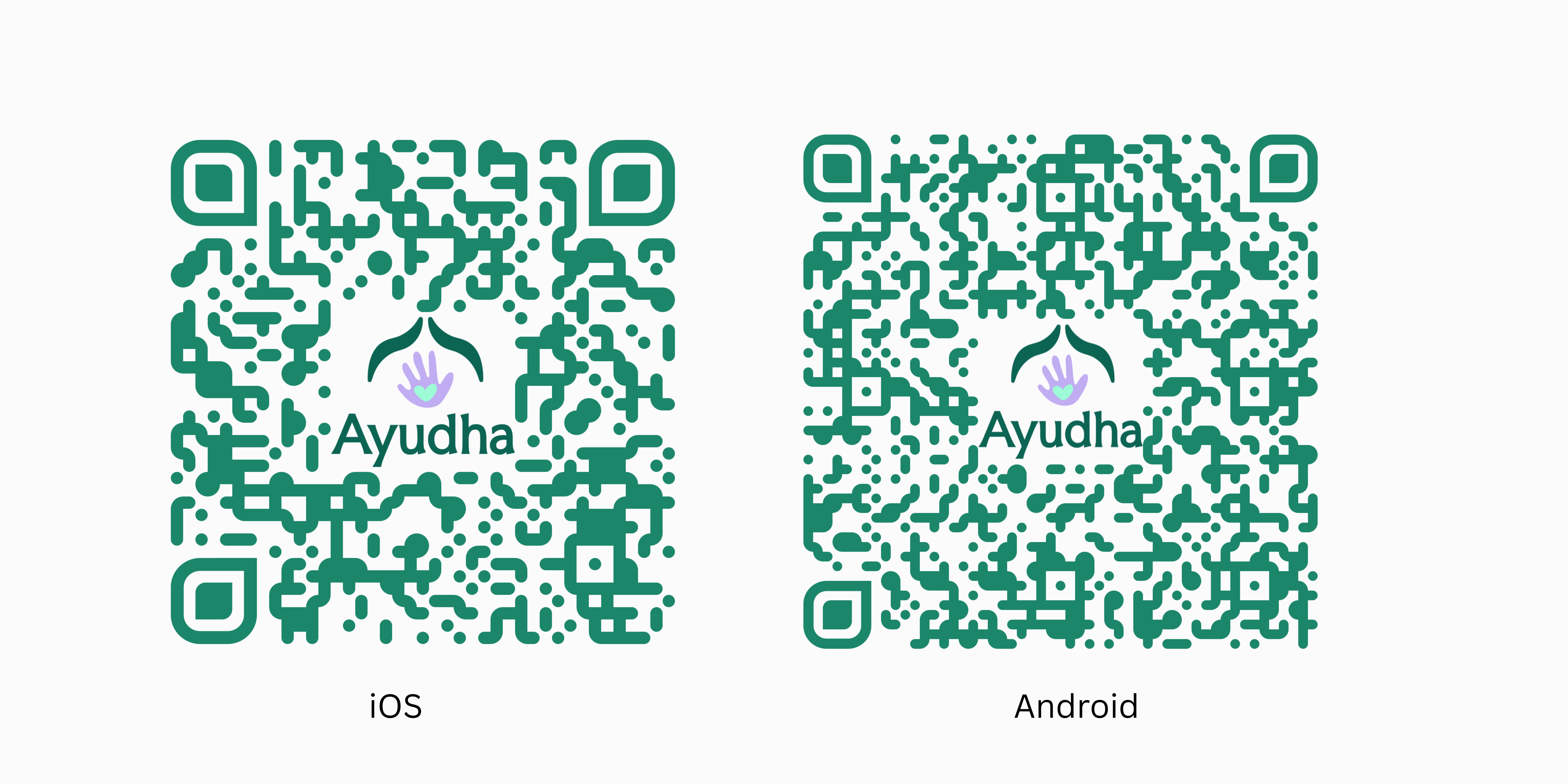 Please scan the appropriate QR code for your personal device (iPhone/iPad = iOS, Android for all other devices), or go to the respective store and look for “Ayudha App – The Crisis Compass".
